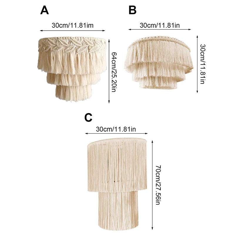 Directions for use: To preserve the beauty of macrame, avoid prolonged exposure to moisture and clean gently with a dry cloth or soft brush. Use a low-temperature LED bulb to reduce heat on contact with the fibers and extend the product's durability.